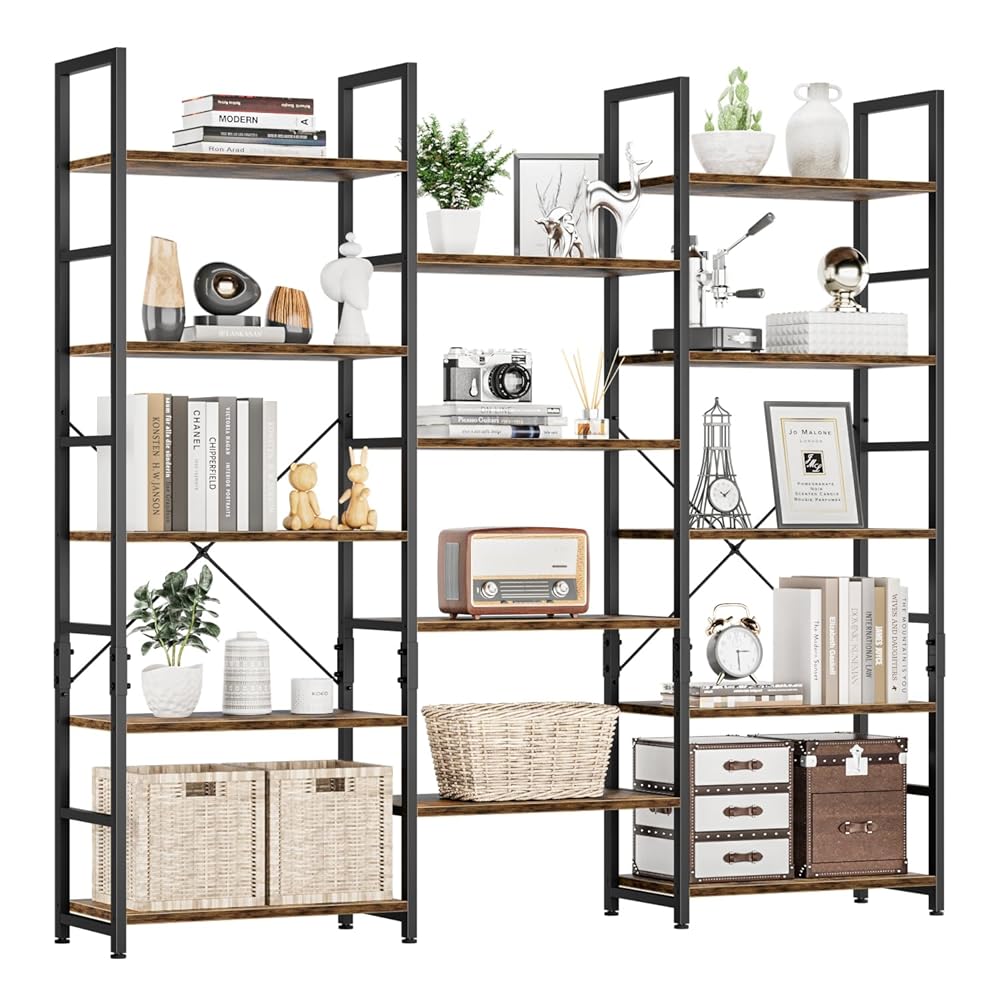 NUMENN Triple Wide 5 Tier Bookshelf, Rustic Industrial Style Bookcases with 14 Open Display Shelves, Modern Tall Bookcase Furniture for Bedroom, Living Room and Home Office,…
