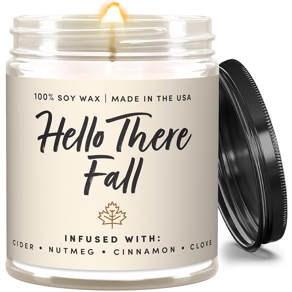 Sweet Water Decor Hello Fall Candle | Cinnamon, Apples, and Clove Autumn Scented Soy Candles for Home | 9oz Clear Jar, 40 Hour Burn Time, Made in the USA