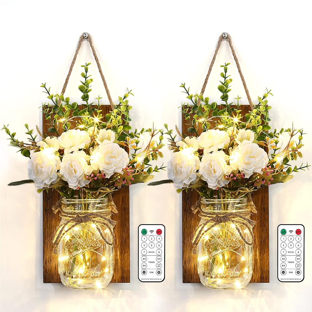 Lightess Mason Jar Wall Sconce with Flower Wood Decoration LED Fairy Lights Rustic Wall Lamp Home Decoration String Light for Party, Wedding Bedroom Wall Decor, 2 Pack
