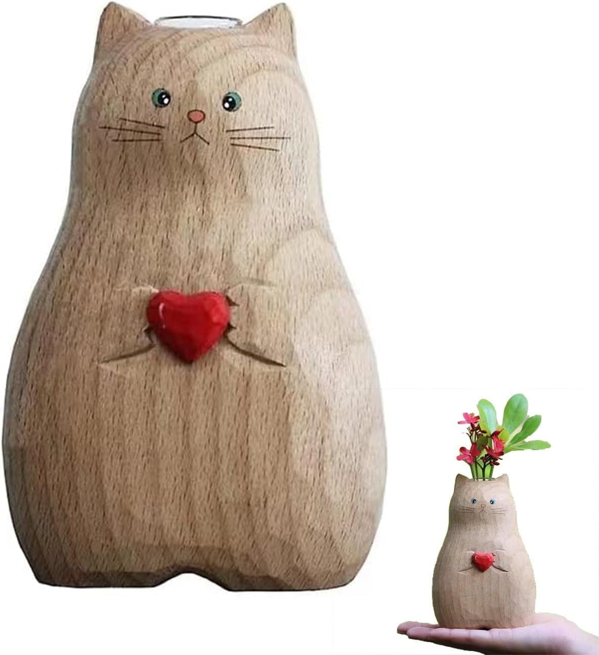 Handcrafted Wooden Cat Vase for Room Decor Aesthetic,Solid Wood Cat Statue Vase, Modern Minimalist Cat Vase Home Decor, Flower Vase for Room Decor Aesthetic,Bedroom Decor Gift…