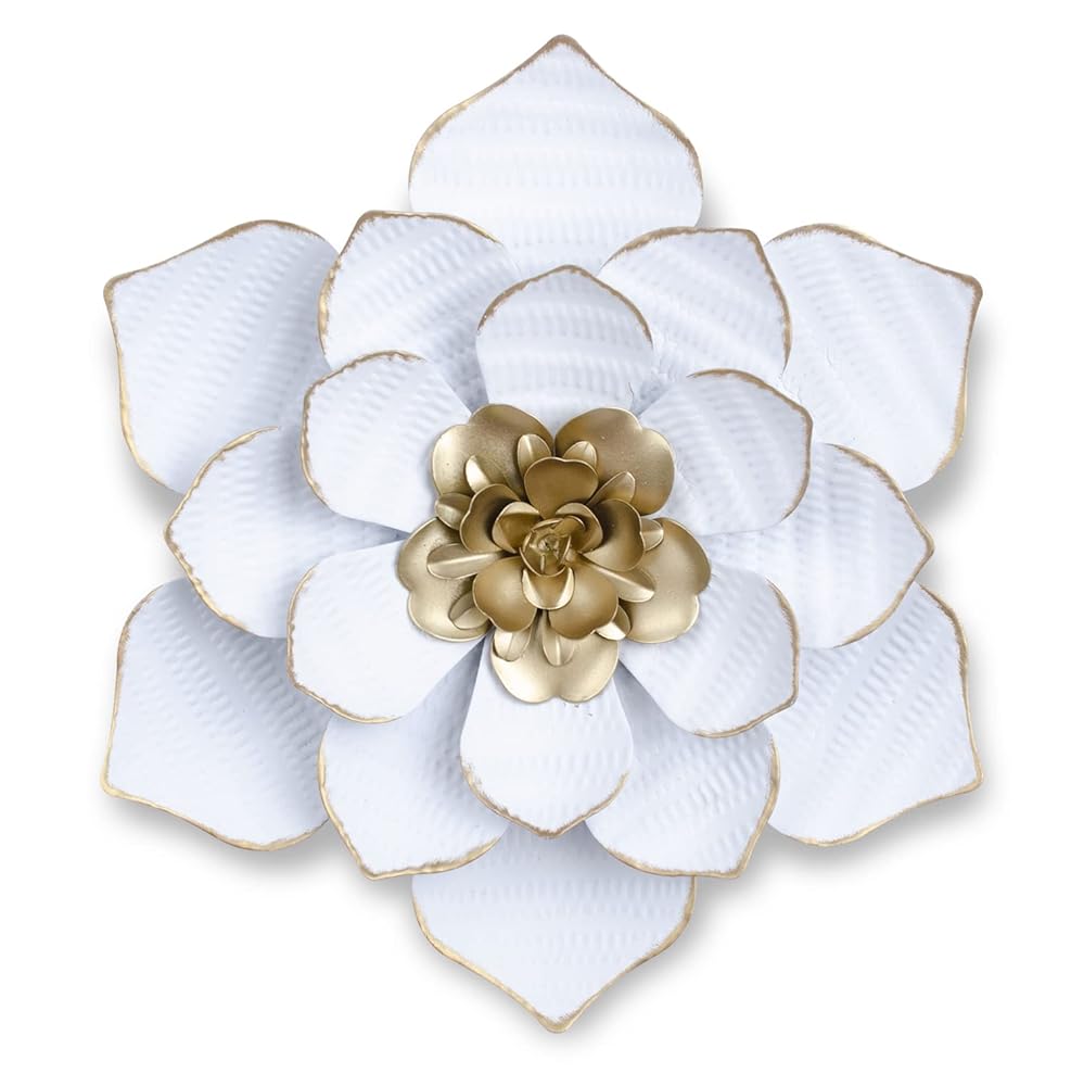 9.5inches Metal Flowers Wall Decor – White 3D Floral Wall Decoration with Special Hammered Metal Layer Home Wall Sculpture Art for Bathroom, Bedroom, Living Room, Kitchen -…