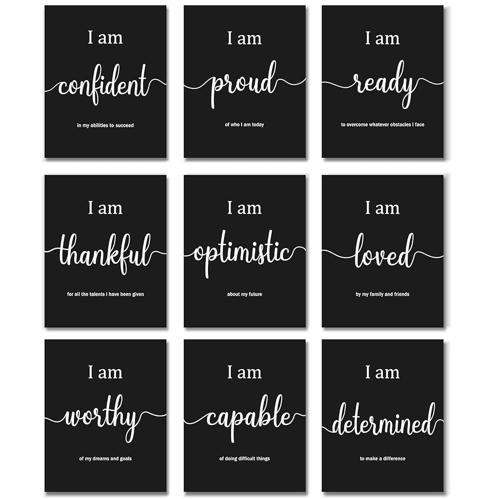 9 Pieces Inspirational Motivational Office Bedroom Wall Art, Daily Positive Affirmations for Men Women Kids Posters Inspirational Quotes Sayings Wall Decor (Black)