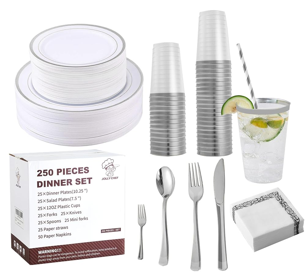 250 Count Silver Disposable Plastic Dinnerware Set, 50 Silver Plastic Plates, 25 Plastic Silverware, 25 Silver Cups and Straws, 50 Napkins, Perfect for Wedding Party