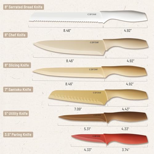 I spend a lot of time in the kitchen and love to cook. These knives are a must have. They are super sharp, come with knife covers and in this set one of everything you need. The bread knife is perfect and I used it on a fresh loaf of bread. My favorite is the santoku knife because I do a lot of dicing and chopping. The utility knife is awesome too. Seriously, you can’t go wrong with this set. It’s everything a cook needs all in one, very pretty, set. I also love the colors. The knives are unusual and so pretty that I put them in a utility jar next to the stove rather than away in a drawer. I don’t use a dishwasher, but these are also dishwasher safe and even come with instructions on how to sharpen them.